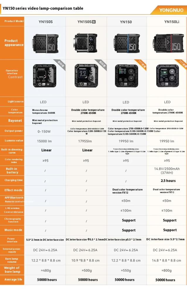 Поискал ещё варианты. Есть более усовершенствованные версии: YN150 Ultra Bi и YN150 Ultra RGB. В рублях ценник на них в 3 раза выше. Там уже есть возможность подключения по Wi-Fi и Bluetooth, возможность подключения различных источников питания (обычный сетевой, USB-C, крепление аккумулятора) + собственно RGB.