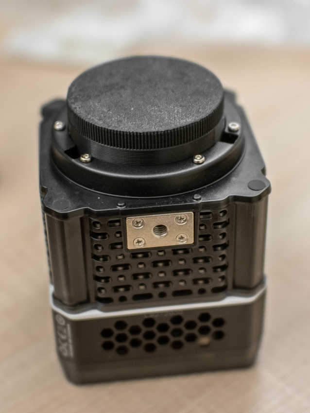 Она надевается на байонет светильника подобным образом и формирует достаточно узкий круг изображения. Нагреваться от светодиода она будет сильно, что может грозить лёгким ожогом при прикосновении к ней на полной мощности, но сам силикон не боится высоких температур. Через имеющееся отверстие происходит обдувка встроенным в светильник вентилятором.