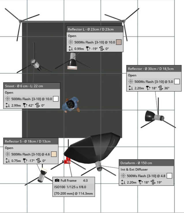 Надо сказать, открыл для себя некоторые интересные моменты. В этой схеме можно управлять «рельефом» лица, жёсткостью света, да и вообще добиться желаемого, по сути не меняя насадки, а лишь изменяя интенсивность источников света.